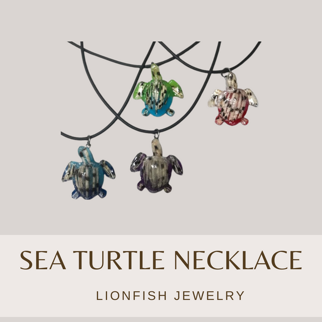 This is a beautiful hand-made, unique Lionfish spine Sea Turtle with natural colored spines or dyed spines and a variety of background colors with rubber cord 18" adjustable necklace created with the non-venomous spines of lionfish caught in the Florida Keys. Spines are naturally yellow to orangish and when dehydrated become a useful part of the lionfish that is usually thrown away.