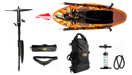 The spearfishing set's board features secure compartments for your fins, spearguns, and masks, while its bright orange color and included safety flag ensure optimal visibility. Throw your catch unto the board before heading back to the shore!